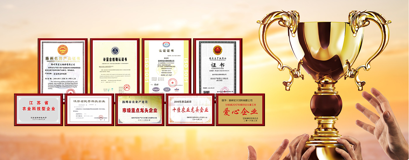先后榮獲江蘇省飼料質(zhì)量合格產(chǎn)品、江蘇省名牌產(chǎn)品、揚(yáng)州市消費(fèi)者滿(mǎn)意商品、揚(yáng)州市質(zhì)量計(jì)量信得過(guò)產(chǎn)品等稱(chēng)號(hào)。